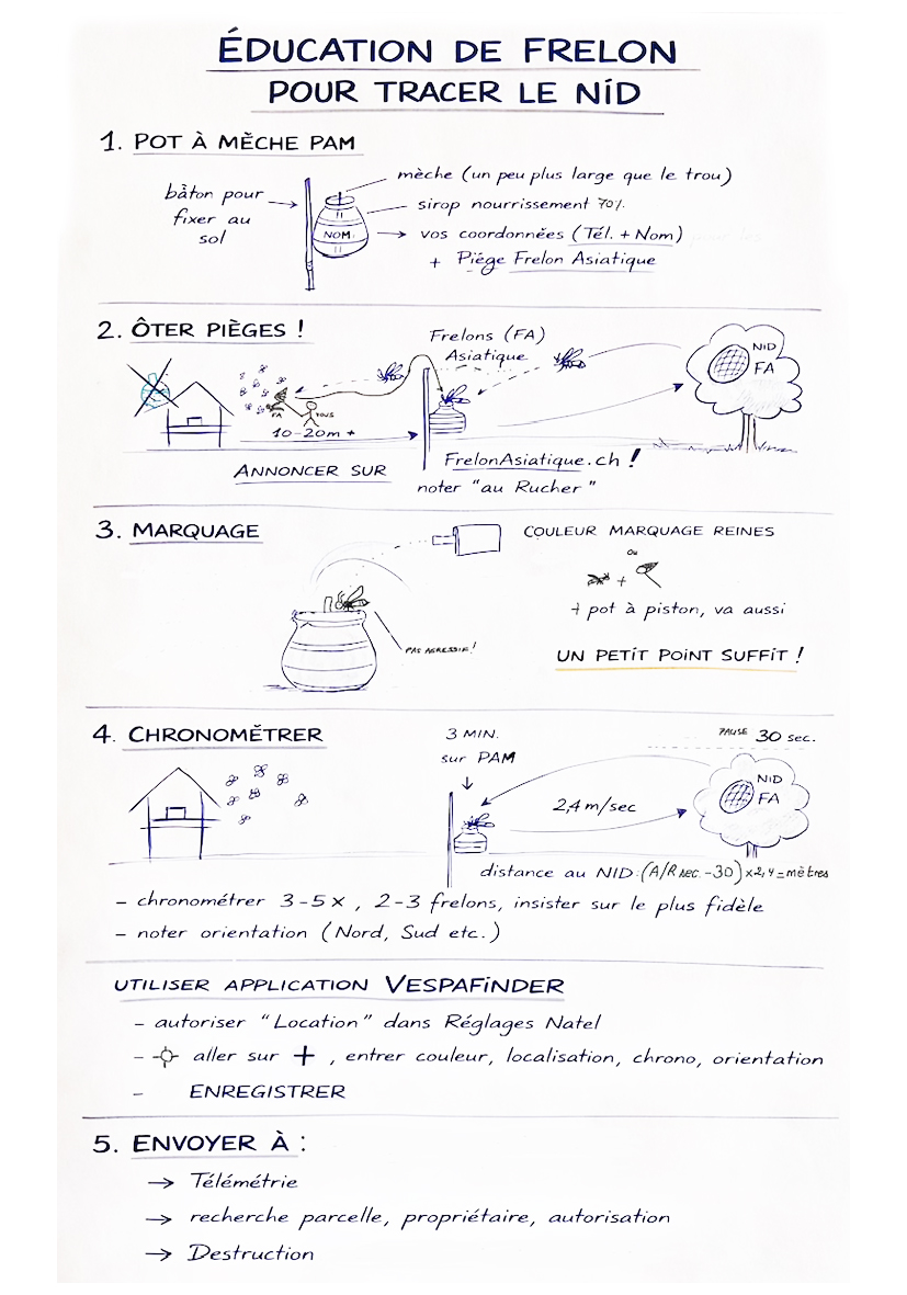 - Dès le mois de juin, la recherche ACTIVE de nids primaires et secondaires est de mise. Tout le monde peut y participer. En plus, les apiculteurs doivent fidéliser des frelons asitiques et procéder à de la triangulation. Vous pouvez suivre ces recommandations.